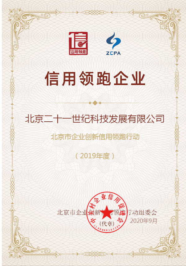 我公司榮獲2019年度" 北京市企業(yè)創(chuàng)新信用領(lǐng)跑企業(yè)" 稱號(hào)