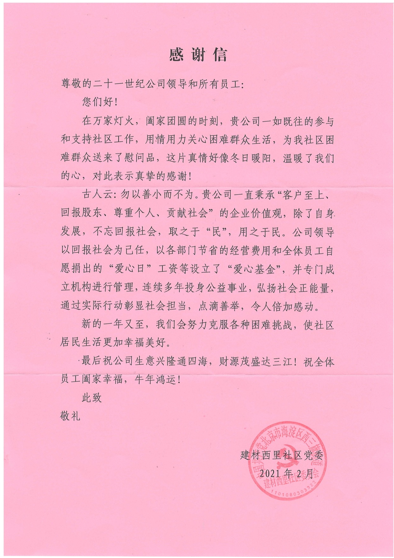 十多年來,公司愛心志愿管理委員會一直堅持組織開展西三旗社區(qū)困難群眾春節(jié)走訪慰問活動。2021年2月24日,西三旗街道建材城聯(lián)合社區(qū)和建材西里社區(qū)領導代表社區(qū)居民送來錦旗,感謝公司全體員工的愛心奉獻和對困難群眾生活的關心關愛,讓社區(qū)特困戶感受到社會大家庭的溫暖。